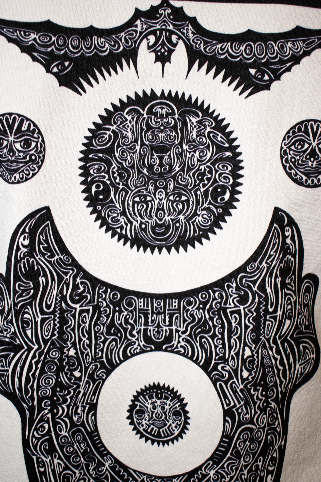 This Celestial Guardians Tee features a stunning, intricate design by local artist Caleb Dowe. The print on this t-shirt is a reproduction of the artist's original ink drawing, making it a unique and eye-catching addition to any wardrobe. Support local artists while making a statement with this beautiful tee.