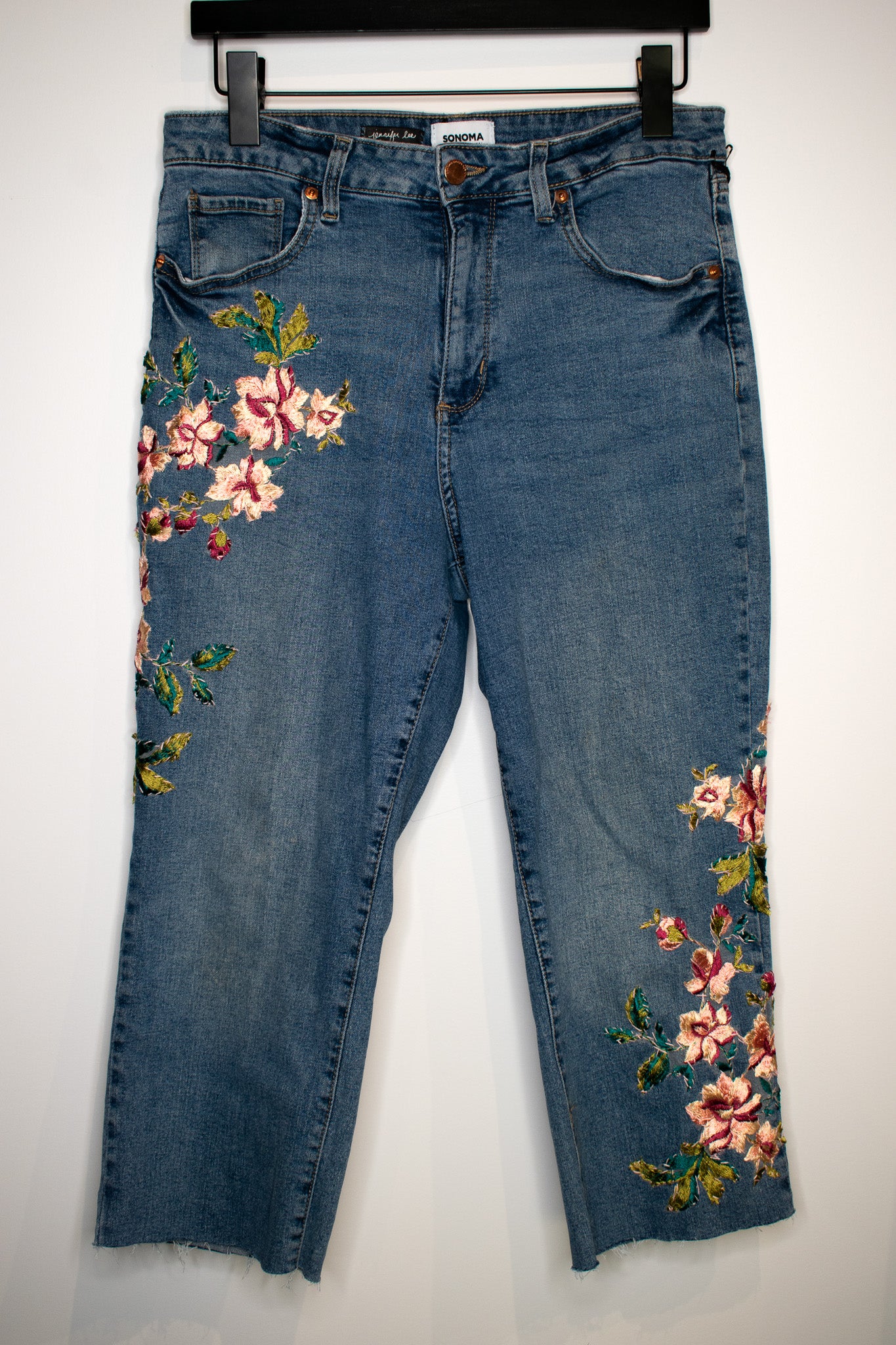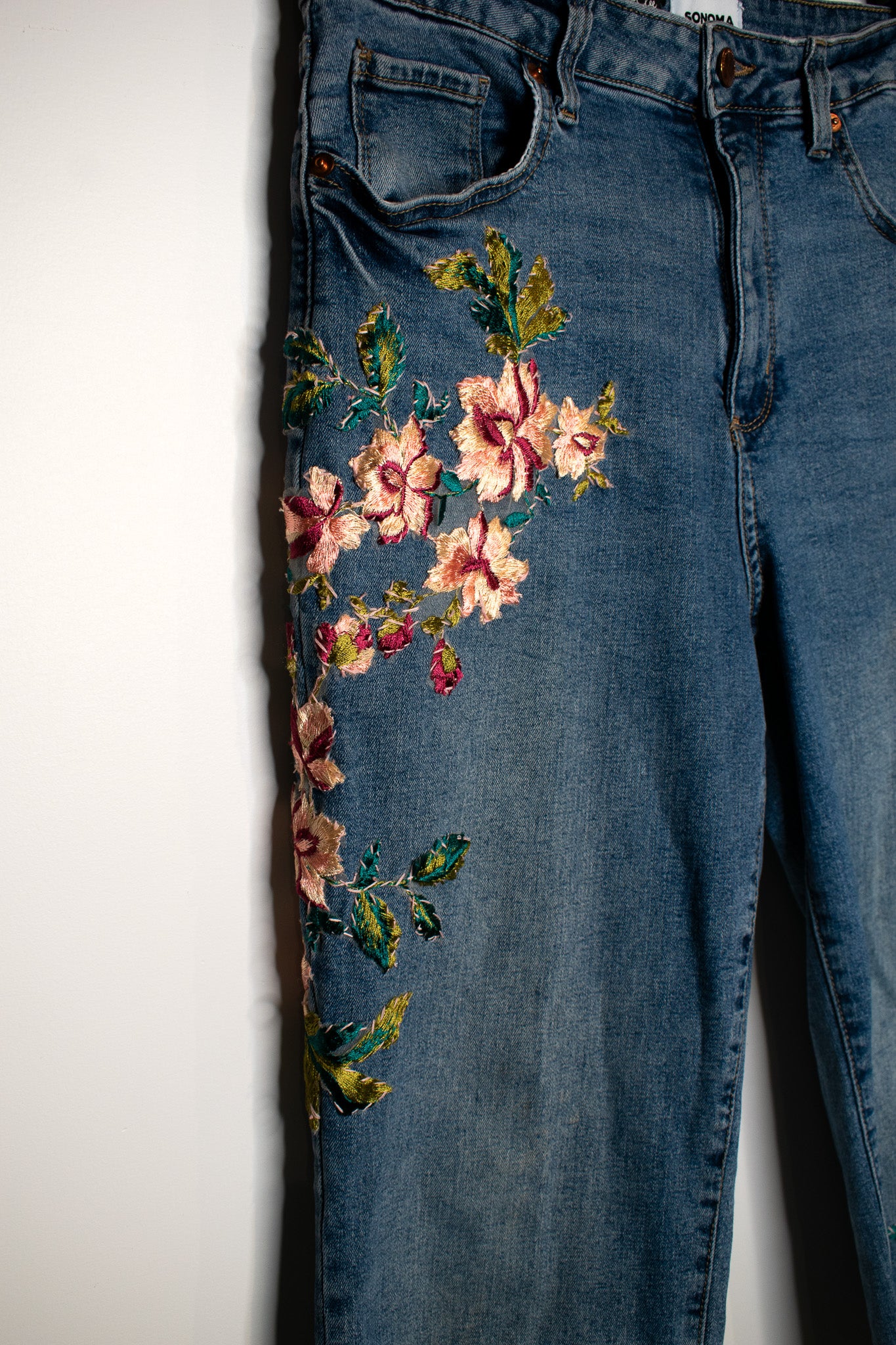 These upcycled blue jeans, hand embroidered in the USA by artist Jennifer Lee, are a unique addition to your wardrobe. Made from high-quality materials, our embroidered denim pants are both stylish and sustainable. Add a touch of art to your everyday look.