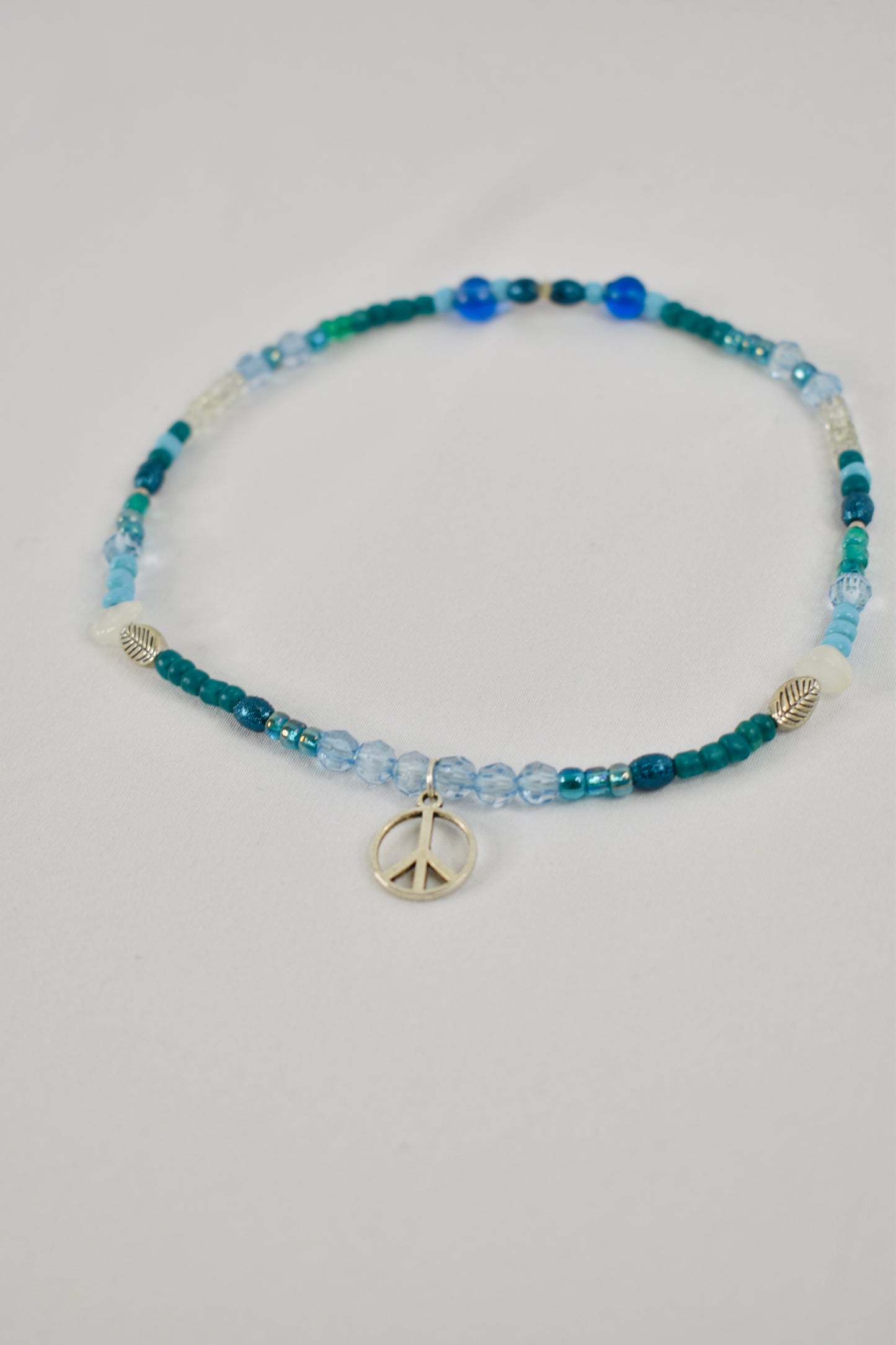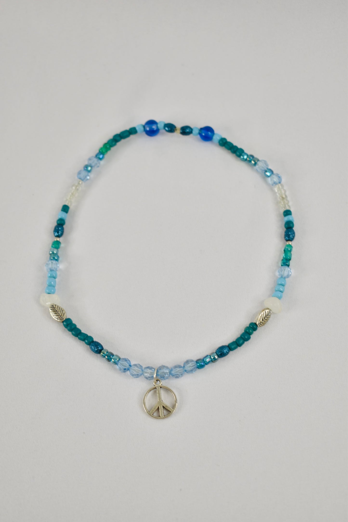 Peace pendant on a hand beaded choker with leaf beads, glass and stone beads.