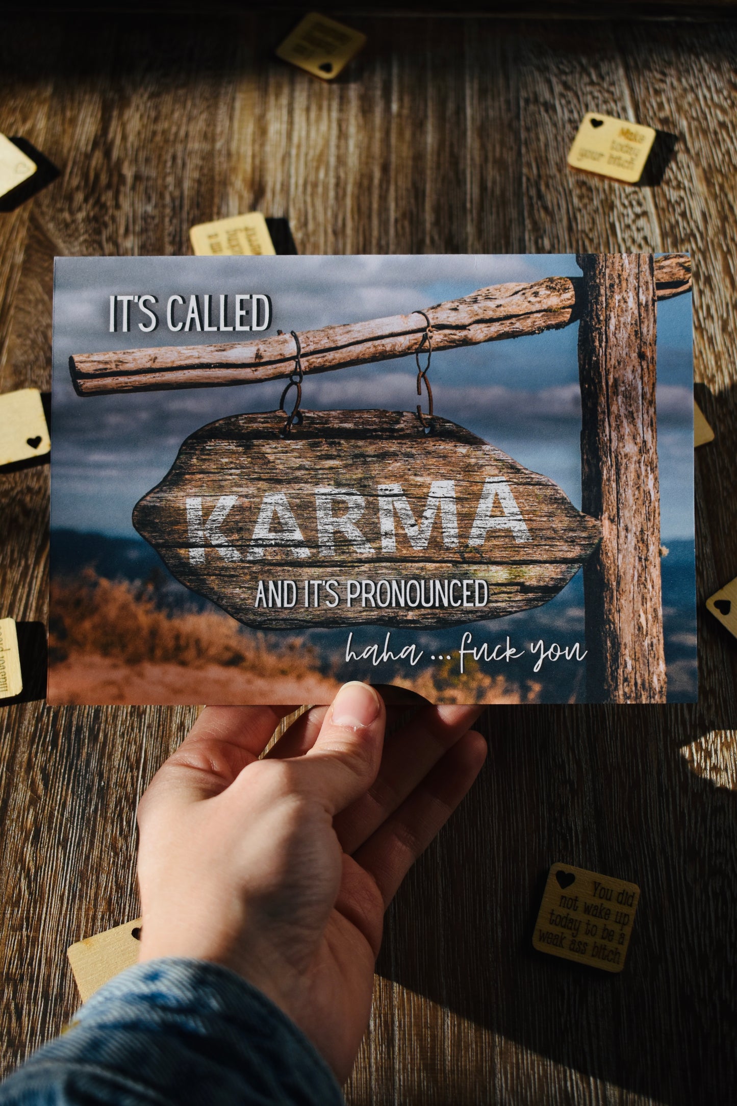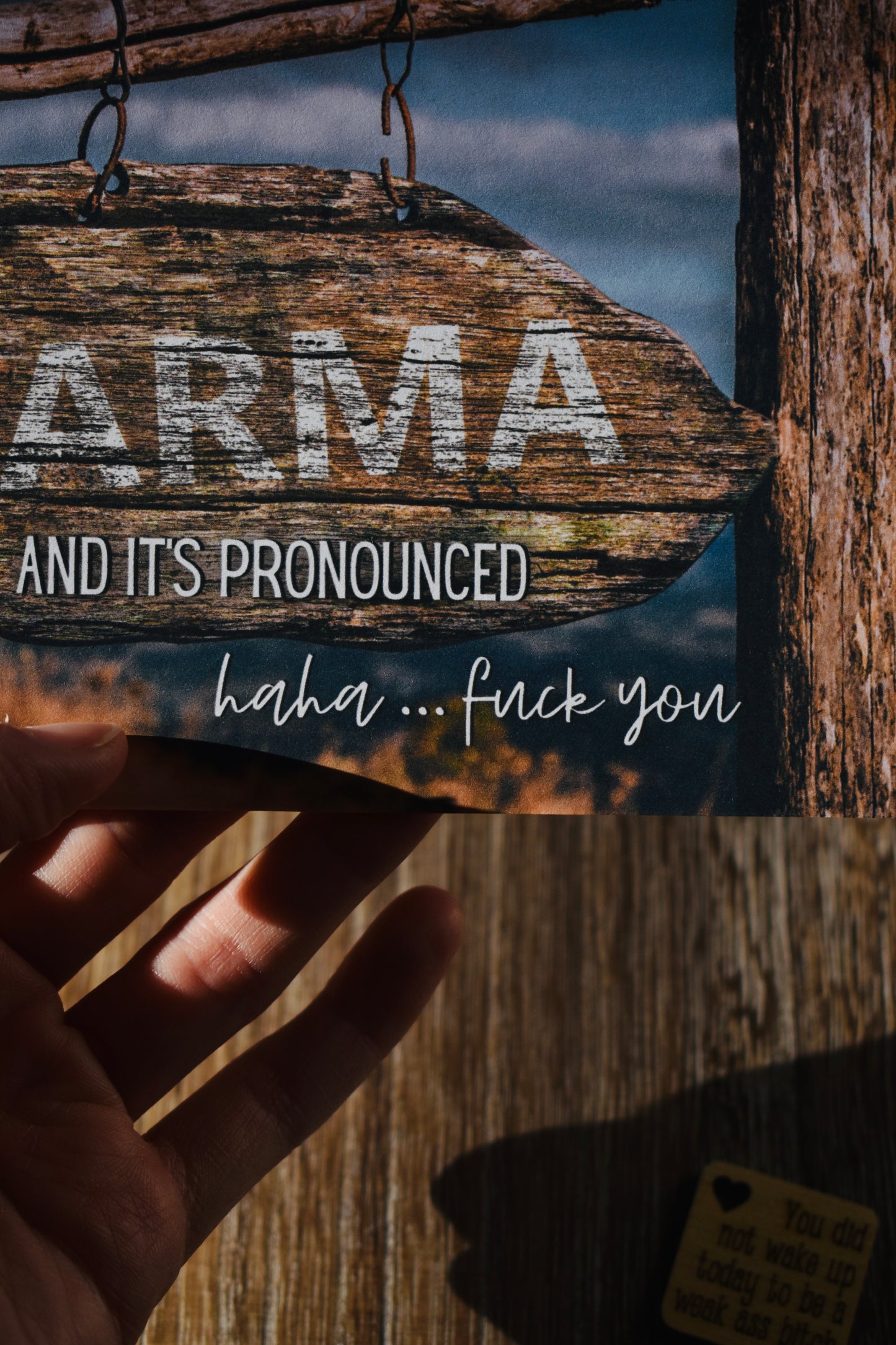 The card reads "It's called Karma and its pronounced haha... F**k you"