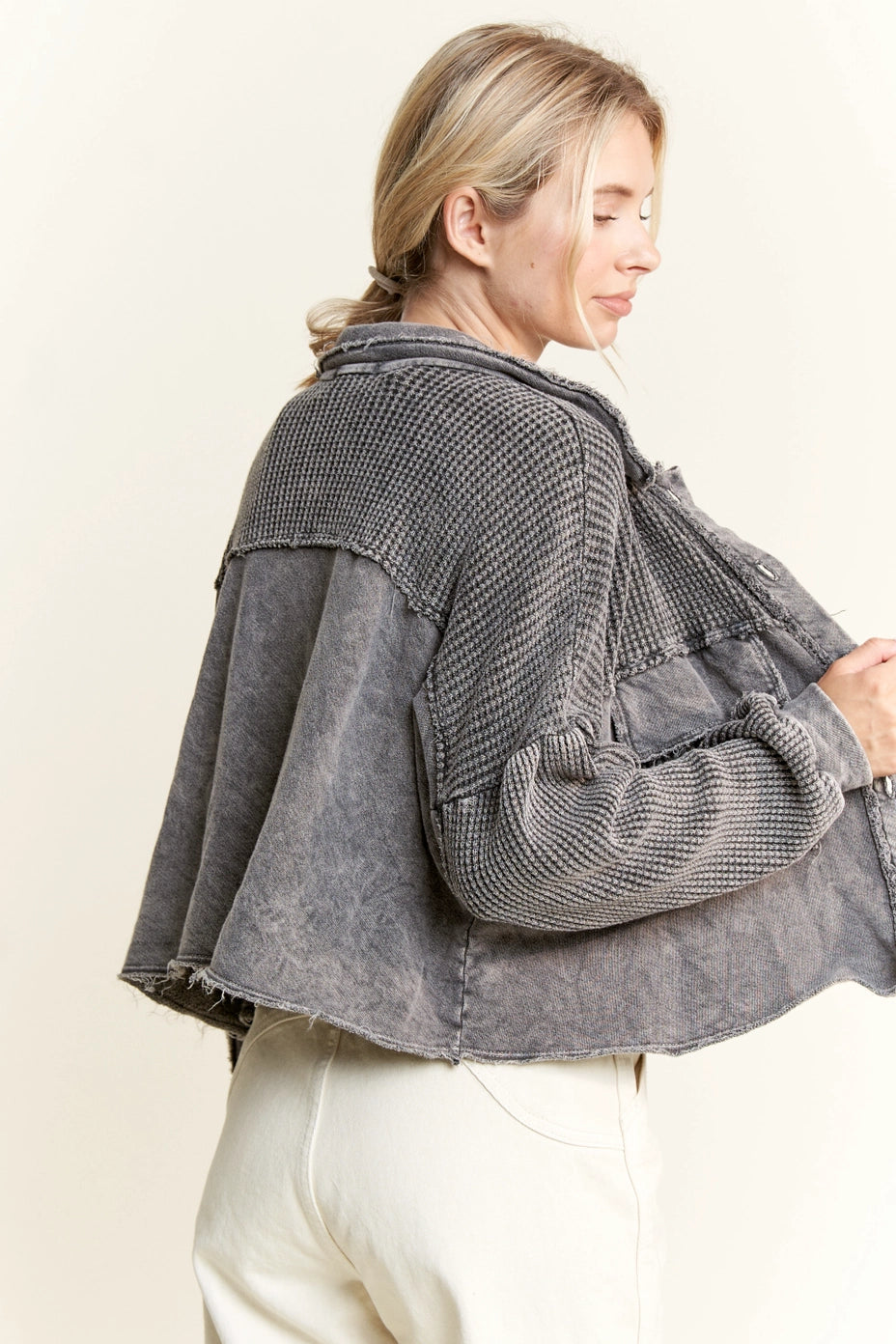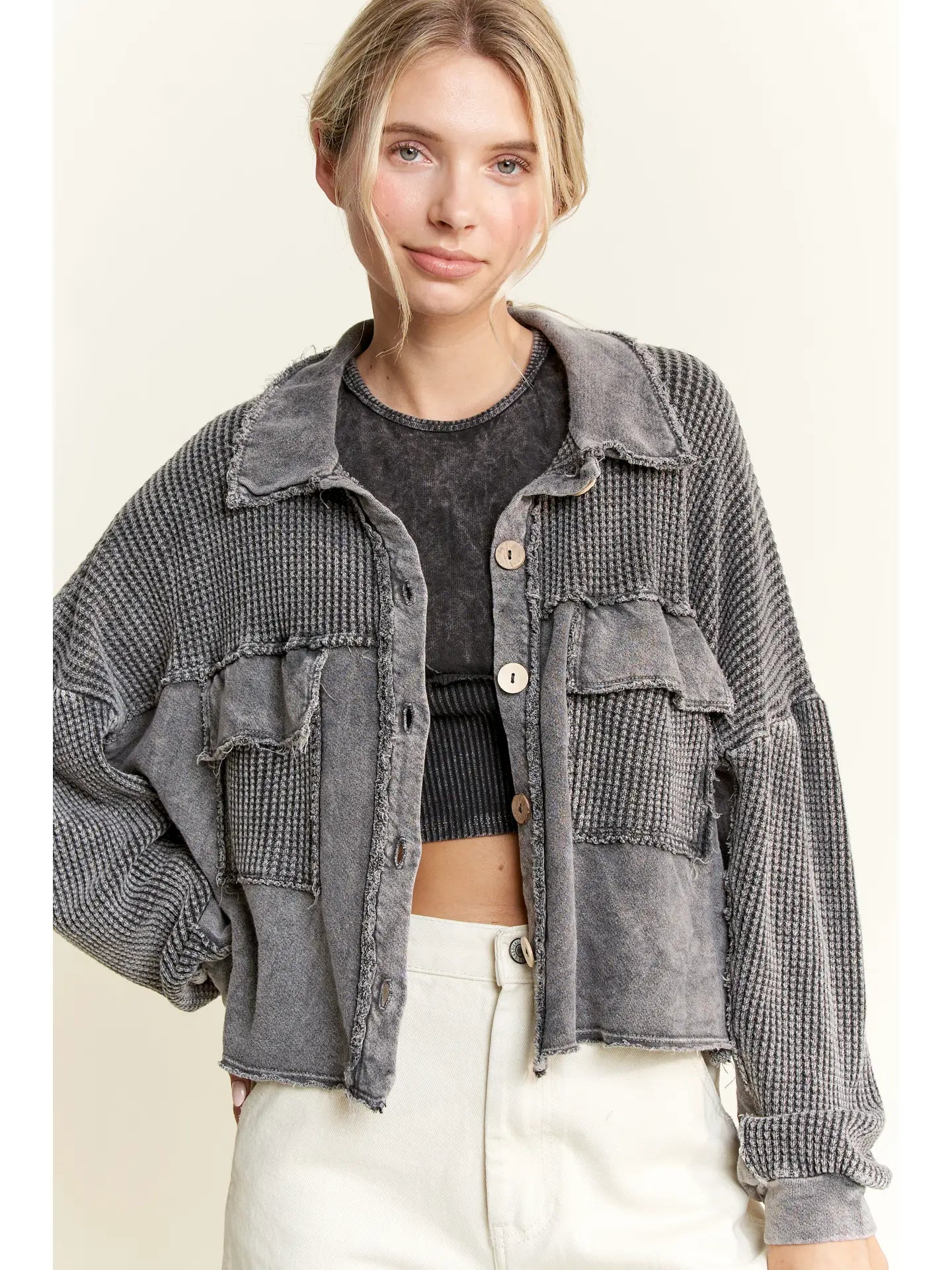 Discover the versatility of the Miner Shacket. This cropped shacket features a mineral washed design and button down closure for a stylish and functional look. Perfect for layering or wearing as a standalone piece, its unique fabric adds a touch of texture to any outfit.