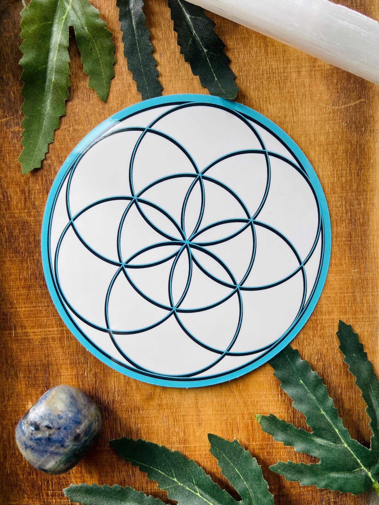 4 x 4 inch circle sticker with a black, white and turquoise Seed of Life design.