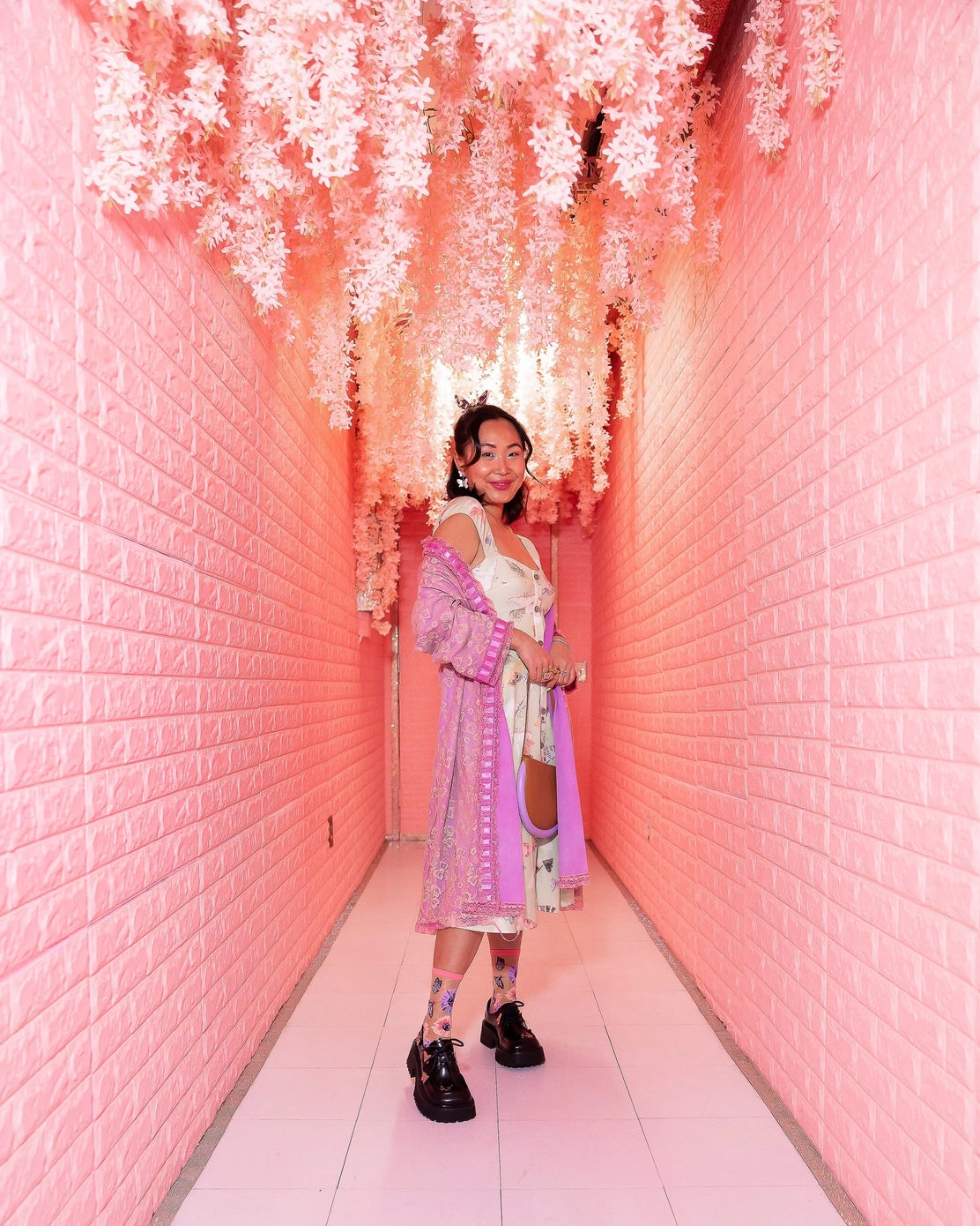 Pink and purple sunflowers make this butterfly floral sock the essence of Spring. As whimsical butterflies make their way up the side of the feet, some bloom into sunflowers for a playful touch. Set against nude sheer fabric for a soft and feminine vibe.